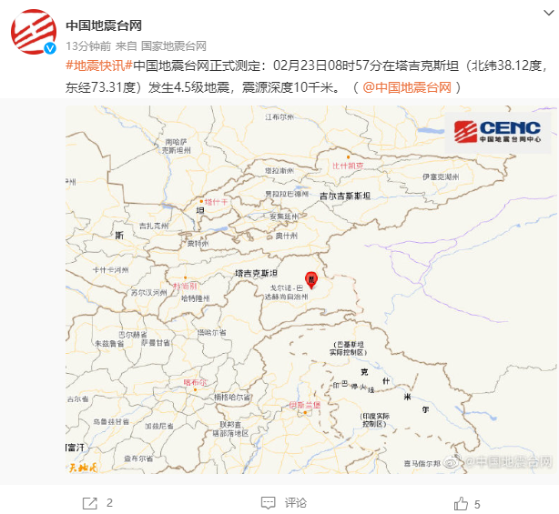 中國地震台網正式測定:02月23日08時57分在塔吉克斯坦(北緯38.12度,東經73.31度)發生4.5級地震,震源深度10千米。