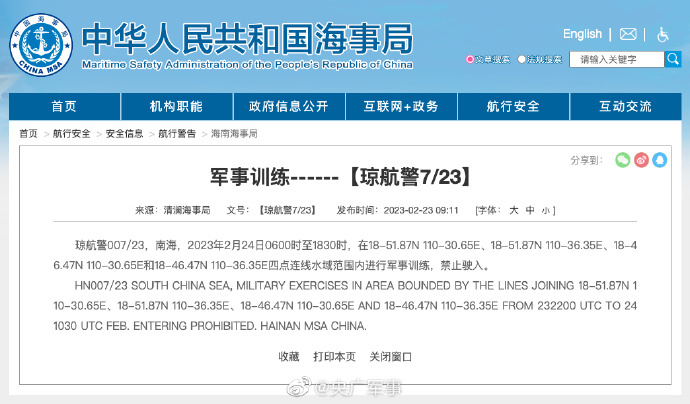 香港新聞網2月23日電 據中國海事局網站消息,清瀾海事局發佈航行警告,2月24日6時至18時30分,南海部分海域進行軍事訓練,禁止駛入。