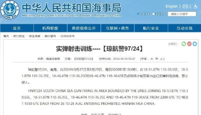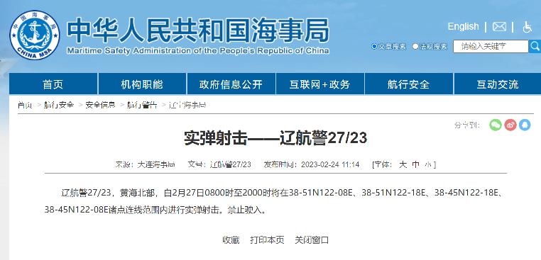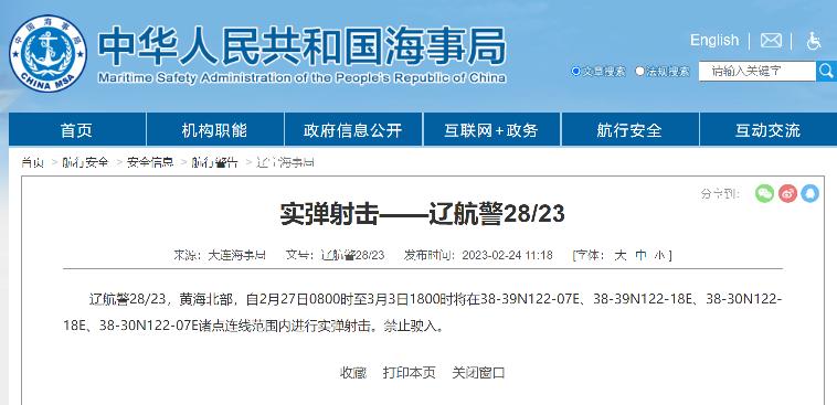 遼航警28/23,黃海北部,自2月27日0800時至3月3日1800時將在38-39N122-07E、38-39N122-18E、38-30N122-18E、38-30N122-07E諸點連線範圍內進行實彈射擊。禁止駛入。
