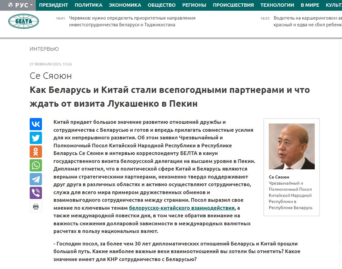 編者按:中華人民共和國駐白俄羅斯共和國特命全權大使謝小用在白俄羅斯總統率團對中國進行國事訪問前夕接受白國家通訊社記者採訪時表示,中方高度重視同白俄羅斯發展友好合作關係,願繼續同白方一道,推動兩國關係不斷邁向前進。他表示,中白是肝膽相照的戰略夥伴,在各領域相互堅定支持、積極開展合作,為全世界樹立了國與國友好交往、互利合作的典範。謝大使還就白中合作的重要議題以及國際議程發表了意見,尤其是提請注意降低國際貨幣結算中對美元的依賴以支持本國貨幣的重要性。 問:大使先生,建交30多年來,白俄羅斯和中國走過了漫長旅程。您認為兩國關係有哪些重要里程碑?與白俄羅斯的合作對中國而言具有何種意義? 答:自1992年1月20日建交以來,中白已走過31年友好合作歷程,兩國關係經受住了國際局勢風雲變幻的考驗,始終保持旺盛生機和活力。31年裏,發生了許多對中白而言具有重大意義的事件。 一是習近平主席訪問白俄羅斯。2015年5月10至12日,應盧卡申科總統邀請,習近平主席對白俄羅斯共和國進行國事訪問。訪問期間,習近平主席分別同盧卡申科總統、白俄羅斯總理、白俄羅斯國民會議共和國院主席和代表院主席等領導人舉行會談、會見,出席中白地區經貿合作論壇開幕式,參觀白俄羅斯偉大衛國戰爭歷史博物館,會見二戰老戰士代表,考察中白工業園,簽署中白友好合作條約和中白關於進一步發展和深化全面戰略夥伴關係的聯合聲明。雙方有關部門和企業還簽署了經貿、海關、教育、文化等一大批合作文件。這次歷史性的訪問以其豐碩的成果被載入中白關係史冊,成為中白關係史上的重要里程碑。 二是盧卡申科總統訪問中國。應習近平主席邀請,盧卡申科總統多次赴華進行國事訪問和出席活動。2013年7月和2016年9月,盧卡申科總統赴華進行進行國事訪問並同習近平主席在北京舉行會談。兩國元首在兩次會談中分別宣布建立中白全面戰略夥伴關係和中白相互信任、合作共贏的全面戰略夥伴關係。此外,盧卡申科總統還於2015年9月赴華出席中國人民抗日戰爭暨世界反法西斯戰爭勝利70周年,於2017年5月和2019年4月赴華出席首屆和第二屆“一帶一路”國際合作高峰論壇,於2018年6月赴華出席上海合作組織青島峰會。盧卡申科總統每一次對中國進行訪問,都將兩國關係向前推動一步,成為中白關係史上的標誌性事件。 三是中白工業園迎來成立十周年。2012年6月5日,盧卡申科總統簽發“關於成立‘巨石’中白工業園”第253號總統令,為工業園的成立提供了法律保障。2015年5月12日,習近平主席和夫人彭麗媛教授在盧卡申科總統陪同下,對園區進行了考察,並共同見證了工業園管委會向首批入園企業頒發入園證書暨意向入園企業向工業園管委會提交入園協議的儀式。十年來,中白雙方保持密切合作,共同推進工業園的發展建設,不斷取得喜人成績。去年底,中白工業園迎來第100家入園企業,標誌園區發展進入了一個新時期。 四是中白建立全天候全面戰略夥伴關係。去年9月,習近平主席和盧卡申科總統在撒馬爾罕舉行會晤並共同決定將中白關係提升至全天候全面戰略夥伴關係,實現了中白關係的歷史性跨躍。兩國元首發表的聯合聲明囊括政治、經貿、農業、人文、科技、國防、司法、執法安全、防災減災、應急救援、環境保護、減緩和適應氣候變化、交通、海關、地方等諸多領域,為中白各領域合作提供了全方位的路線圖,也為中白關係的進一步發展指明了前進方向。 除了上述事件之外,中白兩國還有許多重大事件堪稱雙邊關係的里程碑,在此就不一一細說了。 中白在各領域加強合作,不僅有力維護了雙方的共同利益,促進了彼此的社會經濟發展,更加深了兩國人民的傳統友誼。中方高度重視同白俄羅斯發展友好合作關係,願繼續同白方一道,推動兩國關係不斷邁向前進。 問:當前現實充滿各種挑戰和威脅、地緣政治衝突以及世界權力中心之間的對抗。這在疫情期間更趨激化。然而,白中兩國的合作引人注目,雙方在政治、經濟和人文領域從未有過分歧,始終相互支持。在您看來,這種相互幫助能否為其他國家的合作起到示範作用? 答:我完全贊同您的看法。建交31年來,中白始終秉持相互信任、合作共贏的精神,在各領域相互堅定支持、積極開展合作,為全世界樹立了國與國友好交往、互利合作的典範。 在政治領域,中白是肝膽相照的戰略夥伴。兩國高層交往頻繁,各層級合作機制完善。雙方尊重並支持各自選擇的發展道路和內外政策,在主權、獨立和領土完整等涉及彼此核心利益的問題上相互堅定支持。中方始終堅定支持白方捍衛國家主權和民族尊嚴,反對外部勢力干涉白內政,反對對白進行無理單邊制裁,白方在涉台、涉疆、涉港等問題上予以中方堅定支持。中白在聯合國等國際場合加強協作,共同捍衛了以聯合國為核心的國際體系和以國際法為基礎的國際秩序,共同維護了雙方的主權、安全利益和國際公平正義。 在經濟領域,中白是互利共贏的合作夥伴。兩國經貿投資領域合作不斷推進,共建“一帶一路”成果喜人。根據中方數據,中白雙邊貿易額由建交之初的6080萬美元增長至2022年的50.8億美元,提升近83倍。“巨石”中白工業園示範效應持續顯現,入園企業數量已達107家,行業涉及機械製造、電子商務、新材料、中醫藥、人工智