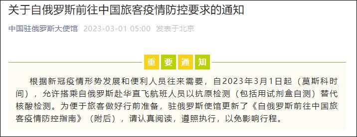 多個駐外使館發通知:來華不再查核酸香港新聞網3月1日電 近日,中國駐多國使館發佈通知稱,3月1日起,來華直飛航班人員可以以抗原檢測替代核酸檢測。 據微信公眾號“中國駐俄羅斯大使館”3月1日消息,根據新冠疫情形勢發展和便利人員往來需要,自2023年3月1日起(莫斯科時間),允許搭乘自俄羅斯赴華直飛航班人員以抗原檢測(包括用試劑盒自測)替代核酸檢測。為便於旅客做好行前準備,駐俄羅斯使館更新了《自俄羅斯前往中國旅客疫情防控指南》(附後),請認真閱讀,遵照執行,以免影響行程。