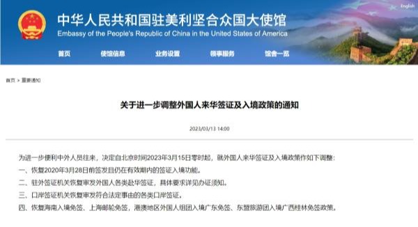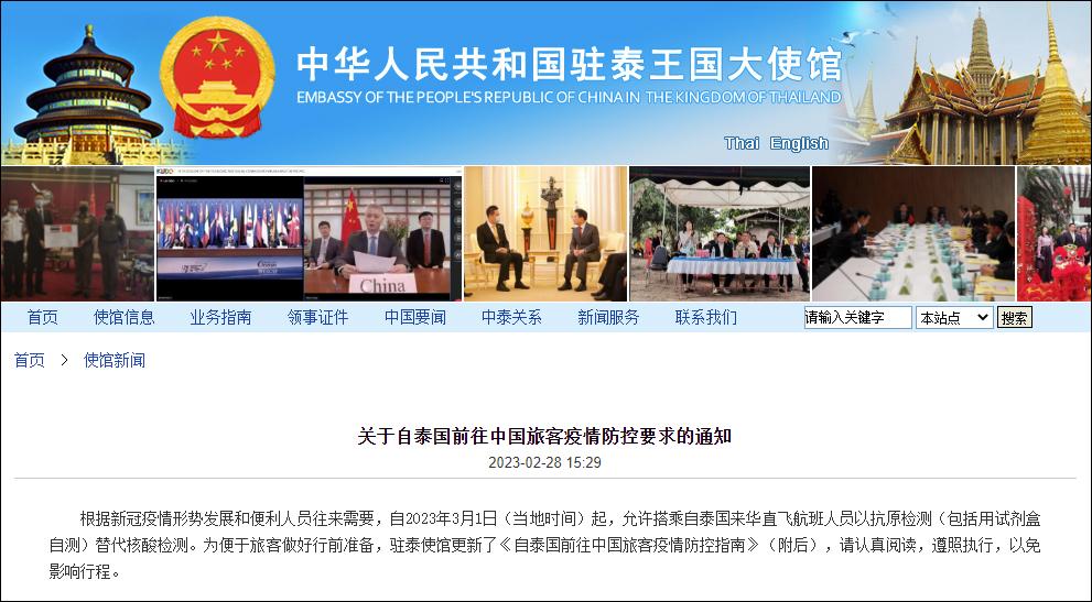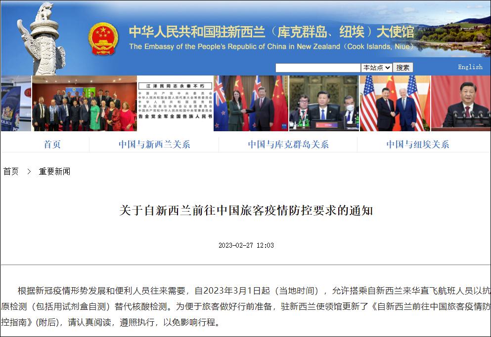 通知稱,根據新冠疫情形勢發展和便利人員往來需要,自2023年3月1日(當地時間)起,允許搭乘自泰國來華直飛航班人員以抗原檢測(包括用試劑盒自測)替代核酸檢測。 中國駐柬埔寨大使館、駐匈牙利大使館當天也發佈通知,3月1日起(當地時間)允許赴華直飛航班人員以抗原檢測(包括用試劑盒自測)替代核酸檢測。 中國駐新西蘭大使館網站2月27日發佈《關於自新西蘭前往中國旅客疫情防控要求的通知》,稱根據新冠疫情形勢發展和便利人員往來需要,自2023年3月1日起(當地時間),允許搭乘自新西蘭來華直飛航班人員以抗原檢測(包括用試劑盒自測)替代核酸檢測。