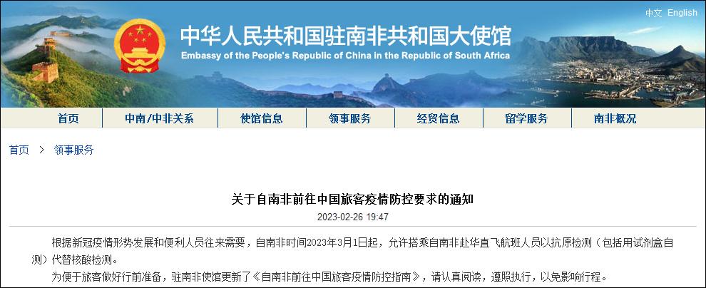 中國駐馬來西亞大使館27日也宣佈,自2023年3月1日起,允許搭乘自馬來西亞赴華直飛航班人員以抗原檢測(包括用試劑盒自測)替代核酸檢測。 同一天,中國駐斯裏蘭卡大使館發佈的通知稱,3月1日起(當地時間),允許搭乘自斯裏蘭卡來華直飛航班人員以抗原檢測(包括用試劑盒自測)替代核酸檢測。 中國駐南非大使館26日發佈的通知顯示,根據新冠疫情形勢發展和便利人員往來需要,自南非時間2023年3月1日起,允許搭乘自南非赴華直飛航班人員以抗原檢測(包括用試劑盒自測)代替核酸檢測。