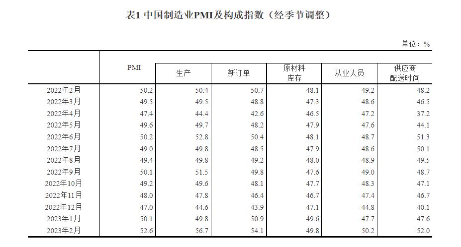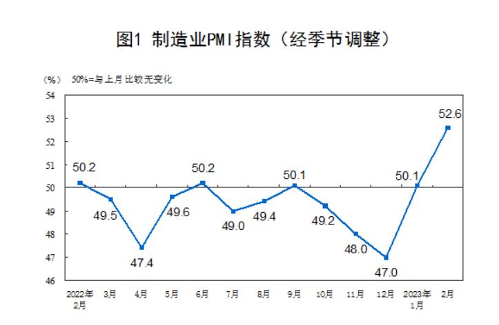 2月製造業PMI為52.6%,過去12個月最高水平香港新聞網3月1日電 3月1日,國家統計局發佈2023年2月中國採購經理指數運行情況。 一、中國製造業採購經理指數運行情況 2月份,製造業採購經理指數(PMI)為52.6%,比上月上升2.5個百分點,高於臨界點,製造業景氣水平繼續上升。
