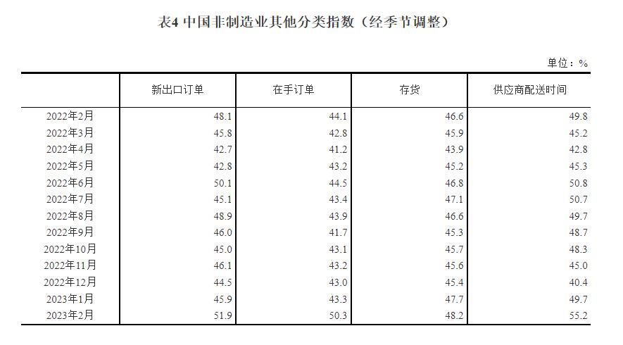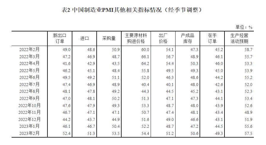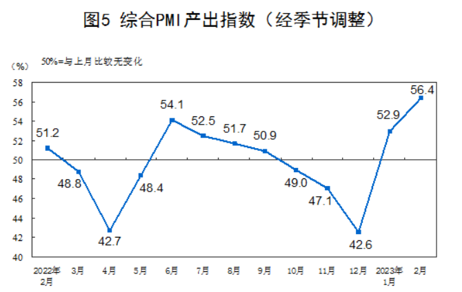 附注 1、主要指標解釋 採購經理指數(PMI),是通過對企業採購經理的月度調查結果統計匯總、編制而成的指數,它涵蓋了企業採購、生產、流通等各個環節,包括製造業和非製造業領域,是國際上通用的監測宏觀經濟走勢的先行性指數之一,具有較強的預測、預警作用。綜合PMI產出指數是PMI指標體系中反映當期全行業(製造業和非製造業)產出變化情況的綜合指數。PMI高於50%時,反映經濟總體較上月擴張;低於50%,則反映經濟總體較上月收縮。 2、調查範圍 涉及《國民經濟行業分類》(GB/T4754-2017)中製造業的31個行業大類,3200家調查樣本;非製造業的43個行業大類,4300家調查樣本。 3、調查方法 採購經理調查採用PPS(Probability Proportional to Size)抽樣方法,以製造業或非製造業行業大類為層,行業樣本量按其增加值占全部製造業或非製造業增加值的比重分配,層內樣本使用與企業主營業務收入成比例的概率抽取。 本調查由國家統計局直屬調查隊具體組織實施,利用國家統計聯網直報系統對企業採購經理進行月度問卷調查。 4、計算方法 (1)分類指數的計算方法。製造業採購經理調查指標體系包括生產、新訂單、新出口訂單、在手訂單、產成品庫存、採購量、進口、主要原材料購進價格、出廠價格、原材料庫存、從業人員、供應商配送時間、生產經營活動預期等13個分類指數。非製造業採購經理調查指標體系包括商務活動、新訂單、新出口訂單、在手訂單、存貨、投入品價格、銷售價格、從業人員、供應商配送時間、業務活動預期等10個分類指數。分類指數採用擴散指數計算方法,即正向回答的企業個數百分比加上回答不變的百分比的一半。由於非製造業沒有合成指數,國際上通常用商務活動指數反映非製造業經濟發展的總體變化情況。 (2)製造業PMI指數的計算方法。製造業PMI是由5個擴散指數(分類指數)加權計算而成。5個分類指數及其權數是依據其對經濟的先行影響程度確定的。具體包括:新訂單指數,權數為30%;生產指數,權數為25%;從業人員指數,權數為20%;供應商配送時間指數,權數為15%;原材料庫存指數,權數為10%。其中,供應商配送時間指數為逆指數,在合成製造業PMI指數時進行反向運算。 (3)綜合PMI產出指數的計算方法。綜合PMI產出指數由製造業生產指數與非製造業商務活動指數加權求和而成,權數分別為製造業和非製造業占GDP的比重。 5、季節調整 採購經理調查是一項月度調查,受季節因素影響,數據波動較大。現發佈的指數均為季節調整後的數據。 國家統計局服務業調查中心高級統計師趙慶河解讀2023年2月中國採購經理指數 2月份採購經理指數持續擴張 2月份,穩經濟政策措施效應進一步顯現,疊加疫情影響消退等有利因素,企業復工復產、復商復市加快,我國經濟景氣水平繼續回升。製造業採購經理指數、非製造業商務活動指數和綜合PMI產出指數分別為52.6%、56.3%和56.4%,高於上月2.5、1.9和3.5個百分點,三大指數均連續兩個月位於擴張區間。 一、製造業採購經理指數明顯上升 2月份,製造業PMI升至52.6%,各分類指數均高於上月,調查的21個行業中有18個位於擴張區間,比上月增加7個,製造業景氣面繼續擴大。 (一)產需兩端同步擴張。隨著春節假日因素和疫情影響消退,製造業企業生產恢復加快,市場需求繼續改善,生產指數和新訂單指數分別為56.7%和54.1%,高於上月6.9和3.2個百分點。從行業情況看,木材加工及家具製造、金屬製品、電氣機械器材等行業兩個指數均升至60.0%以上高位景氣區間,行業產需活躍度回升。 (二)價格指數高於上月。受市場需求回暖帶動,製造業原材料採購價格總體水平繼續上升,主要原材料購進價格指數升至54.4%,高於上月2.2個百分點,其中鋼鐵及相關下遊行業漲幅更為明顯,黑色金屬冶煉及壓延加工、通用設備、專用設備等行業主要原材料購進價格指數均高於60.0%。出廠價格指數為51.2%,高於上月2.5個百分點,重返擴張區間,製造業產品銷售價格總體水平有所回升。 (三)各規模企業PMI均高於臨界點。大、中、小型企業PMI分別為53.7%、52.0%和51.2%,高於上月1.4、3.4和4.0個百分點,各規模企業景氣水平不同程度回升,其中小型企業PMI自2021年5月份以來首次升至擴張區間。大、中、小型企業生產指數和新訂單指數均位於擴張區間,產需較上月有所增長。 (四)重點行業PMI繼續上升。裝備製造業、高技術製造業、高耗能行業和消費品行業PMI分別為54.5%、53.6%、51.6%和51.3%,高於上月3.8、1.1、3.0和0.4個百分點,均位於擴張區間,景氣水平連續兩個月回升。隨著生產和需求加快釋放,企業採購活動明顯增加,四個重點行業採購量指數均高於上月,分別為54.5%、50.9%、52.3%和54.5%。 (五)市場預期繼續改善。生產經營活動預期指數為57.5%,高於上月1.9個百分點,升至近12個月來高點,企業信心繼續增強。從行業情況看,調查的21個行業生產經營活動預期指數全部位於景氣區間,其中農副食品加工、紡織、通用設備、專用設備、汽車等10個行業位於60.0%以上高位景氣區間,企業對近期行業恢復發展較為樂觀。 二、非製造業商務活動指數繼續回升 2月份,非製造業商務活動指數為56.3%,比上月上升1.9個百分點,連續兩個月位於景氣區間,非製造業恢復發展態勢向好。 (一)服務業景氣水平升至較高景氣區間。春節過後服務業復商復市加快,景氣水平升至近期高點,服務業商務活動指數為55.6%