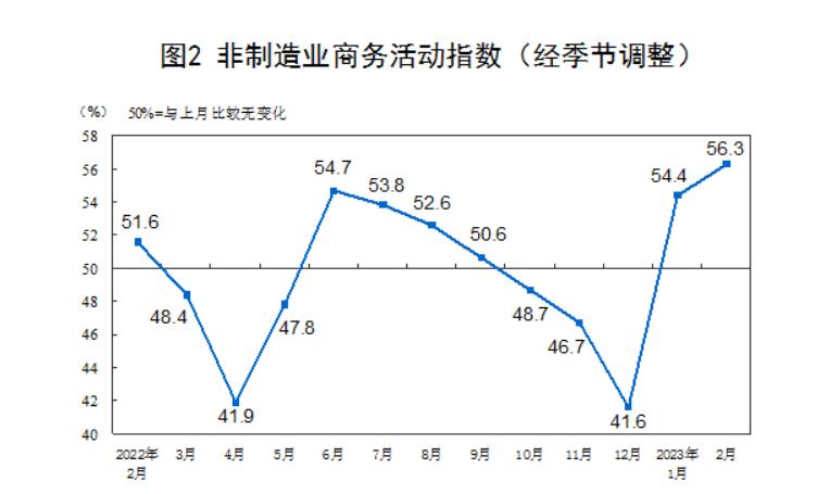 二、中國非製造業採購經理指數運行情況 2月份,非製造業商務活動指數為56.3%,比上月上升1.9個百分點,高於臨界點,非製造業恢復發展態勢向好。