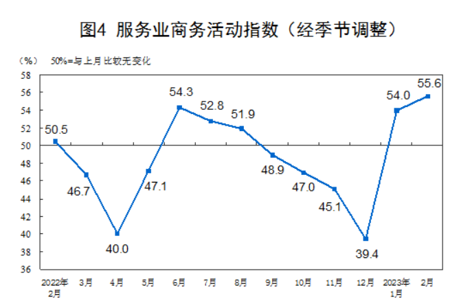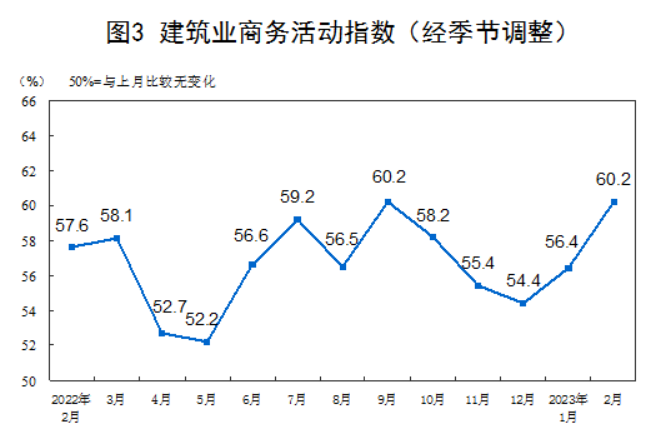 分行業看,建築業商務活動指數為60.2%,比上月上升3.8個百分點。服務業商務活動指數為55.6%,比上月上升1.6個百分點。從行業情況看,道路運輸、航空運輸、郵政、住宿、租賃及商務服務等行業商務活動指數位於60.0%以上高位景氣區間;批發、保險等行業商務活動指數低於臨界點。