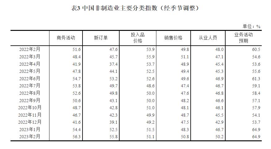 新訂單指數為55.8%,比上月上升3.3個百分點,高於臨界點,表明非製造業市場需求繼續回暖。分行業看,建築業新訂單指數為62.1%,比上月上升4.7個百分點;服務業新訂單指數為54.7%,比上月上升3.1個百分點。 投入品價格指數為51.1%,比上月下降0.4個百分點,高於臨界點,表明非製造業企業用於經營活動的投入品價格總體水平漲幅回落。分行業看,建築業投入品價格指數為55.3%,與上月持平;服務業投入品價格指數為50.4%,比上月下降0.5個百分點。 銷售價格指數為50.8%,比上月上升2.5個百分點,高於臨界點,表明非製造業銷售價格總體水平有所上升。分行業看,建築業銷售價格指數為53.6%,比上月上升0.8個百分點;服務業銷售價格指數為50.4%,比上月上升2.9個百分點。 從業人員指數為50.2%,比上月上升3.5個百分點,表明非製造業企業用工量較上月有所增加。分行業看,建築業從業人員指數為58.6%,比上月上升5.5個百分點;服務業從業人員指數為48.7%,比上月上升3.2個百分點。 業務活動預期指數為64.9%,與上月持平,高於臨界點,表明非製造業企業對近期市場恢復發展預期向好。分行業看,建築業業務活動預期指數為65.8%,比上月下降2.4個百分點;服務業業務活動預期指數為64.8%,比上月上升0.5個百分點。