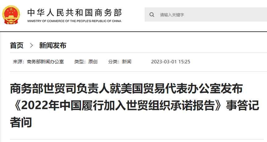 美方發佈《2022年中國履行加入世貿組織承諾報告》,商務部回應分享到:
