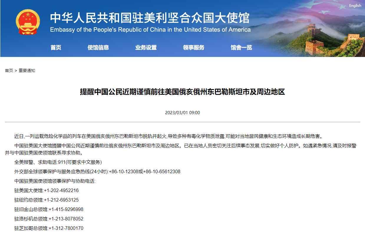 中國駐美國大使館提醒中國公民近期謹慎前往俄亥俄州東巴勒斯坦市及周邊地區。已在當地人員密切關注後續事態發展,切實做好個人防護。如遇緊急情況,請及時報警並與中國駐美國使領館聯系尋求協助。 全美報警、求助電話:911(可要求中文服務) 外交部全球領事保護與服務應急熱線(24小時):+86-10-12308或+86-10-65612308 中國駐美國使領館領事保護與協助電話: 駐美國大使館:+1-202-4952216 駐紐約總領館:+1-212-6953125 駐舊金山總領館:+1-415-9296998 駐洛杉磯總領館:+1-213-8078052 駐芝加哥總領館:+1-312-7800170 【編輯:丘志彬】