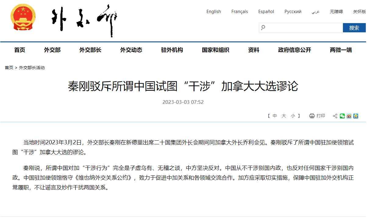 香港新聞網3月3日電 中國外交部網站消息,當地時間2023年3月2日,外交部長秦剛在新德里出席二十國集團外長會期間同加拿大外長喬利會見。秦剛駁斥了所謂中國駐加使領館試圖“干涉”加拿大大選的謬論。