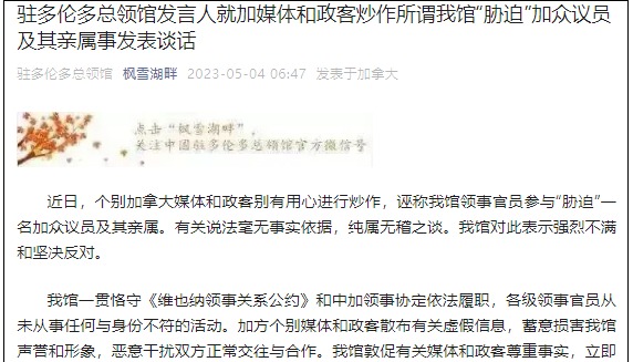 秦剛說,所謂中國對加“干涉行為”完全是子虛烏有、無稽之談,中方堅決反對。中國從不干涉別國內政,也反對任何國家干涉別國內政。中國駐加使領館恪守《維也納外交關係公約》,致力於促進中加關係和各領域交流合作。加方應採取切實措施,保障中國駐加外交機構正常履職,不讓謠言及炒作干擾兩國關係。 【編輯:丘志彬】