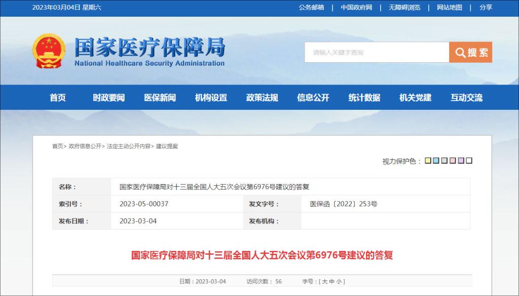 香港新聞網3月6日電 據國家醫保局官網,3月4日,國家醫保局發佈對十三屆全國人大五次會議第6976號建議的答復。