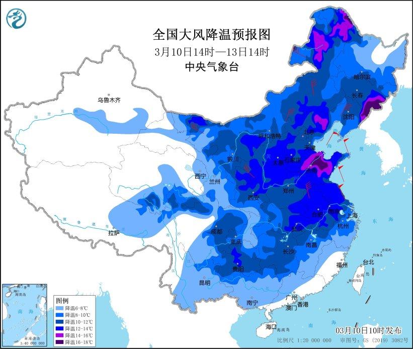 香港中通社3月10日電 據中國中央氣象台,受寒潮影響,預計10日8時至13日8時,中國中東部大部地區氣溫下降6-10℃,內蒙古、華北、黃淮、江淮東部等地氣溫下降12℃,局部超過16℃。