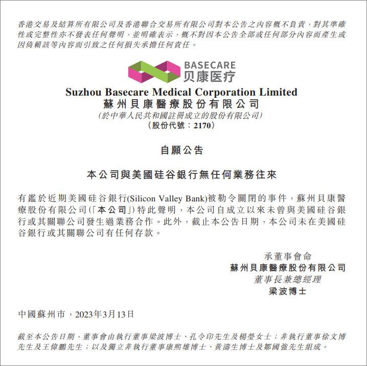 矽谷銀行破產,多家中企回應存款情況香港新聞網3月13日電 3月13日早間,多家公司在港交所發佈公告,回應與矽谷銀行宣佈破產有關事項。 貝康醫療:未在美國矽谷銀行或其關聯公司有任何存款 貝康醫療3月13日早間在港交所公告,有鑒於近期美國矽谷銀行(Silicon Valley Bank)被勒令關閉的事件,公司特此聲明,公司自成立以來未曾與美國矽谷銀行或其關聯公司發生過業務合作。此外,截止本公告日期,公司未在美國矽谷銀行或其關聯公司有任何存款。