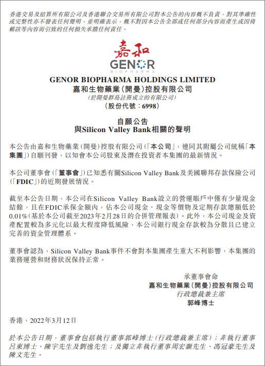 嘉和生物:公司矽谷銀行賬戶僅有少量現金結餘且在承保金額內 嘉和生物3月13日早間在港交所公告,董事會已知悉有關Silicon Valley Bank及美國聯邦存款保險公司(FDIC)的近期發展情況。截至本公告日期,公司在Silicon Valley Bank設立的營運賬戶中僅有少量現金結餘,且在FDIC承保金額內,佔公司現金、現金等價物及定期存款總額低於0.01%(基於本公司截至2023年2月28日的合並管理報表)。董事會認為,Silicon Valley Bank事件不會對集團產生重大不利影響,集團的業務運營和財務狀況保持正常。
