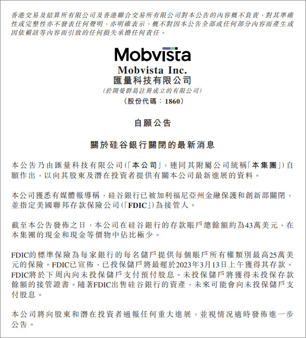 匯量科技:公司在矽谷銀行存款賬戶總餘額約43萬美元 匯量科技3月13日早間在港交所公告,截至本公告發佈之日,公司在矽谷銀行的存款賬戶總餘額約為43萬美元,在集團的現金和現金等價物中佔比極少。美國聯邦存款保險公司(FDIC)的標準保險為每家銀行的每名儲戶提供每個賬戶所有權類別最高25萬美元的保險。FDIC已宣佈,已投保儲戶將最遲於2023年3月13日上午獲得其存款。FDIC將於下周內向未投保儲戶支付預付股息。未投保儲戶將獲得未投保存款餘額的接管證書。隨著FDIC出售矽谷銀行的資產,未來可能會向未投保儲戶支付股息。