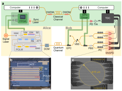 香港新聞網3月14日電 近日,中國科學技術大學潘建偉、徐飛虎等與上海微系統所、濟南量子技術研究院、哈爾濱工業大學等單位的科研人員合作,通過發展高保真度集成光子學量子態調控、高計數率超導單光子探測等關鍵技術,首次在國際上實現百兆比特率的實時量子密鑰分發,實驗結果將此前的成碼率紀錄提升一個數量級。該成果於3月14日在線發表於國際學術期刊《自然-光子學》。