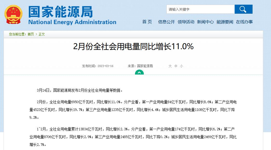 2月份全社會用電量同比增長11%,其中第二產業增長19.7%分享到: