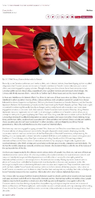 中國駐加大使在加媒撰文:污衊中國“干涉內政”鬧劇可休矣香港新聞網3月17日電 中國駐加拿大大使叢培武近日在加首都地區主流媒體《渥太華生活》發表署名文章指出,污衊中國“干涉加拿大內政”的鬧劇可以休矣。