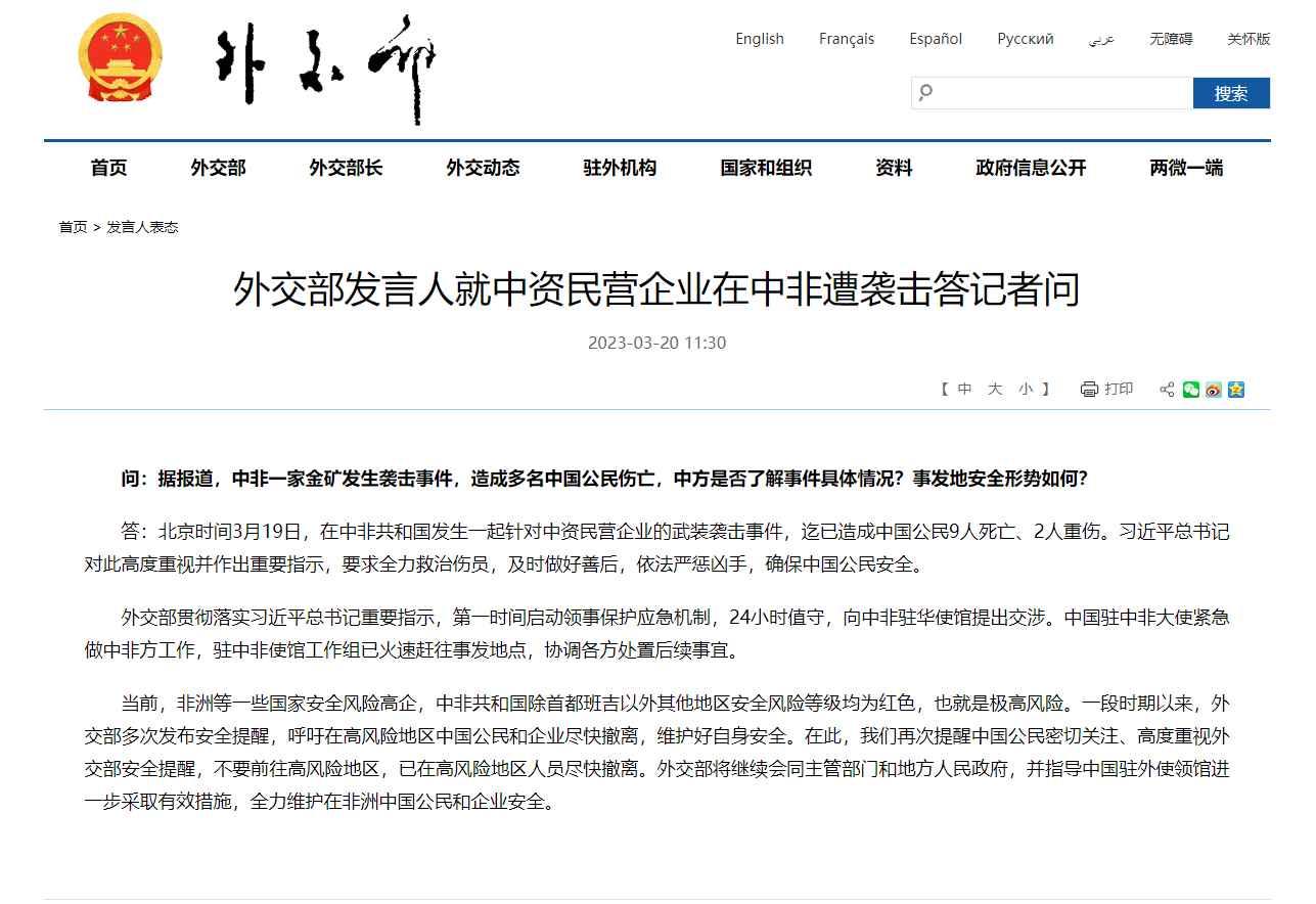 問:據報道,中非一家金礦發生襲擊事件,造成多名中國公民傷亡,中方是否了解事件具體情況?事發地安全形勢如何? 答:北京時間3月19日,在中非共和國發生一起針對中資民營企業的武裝襲擊事件,迄已造成中國公民9人死亡、2人重傷。習近平總書記對此高度重視並作出重要指示,要求全力救治傷員,及時做好善後,依法嚴懲兇手,確保中國公民安全。 外交部貫徹落實習近平總書記重要指示,第一時間啟動領事保護應急機制,24小時值守,向中非駐華使館提出交涉。中國駐中非大使緊急做中非方工作,駐中非使館工作組已火速趕往事發地點,協調各方處置後續事宜。 當前,非洲等一些國家安全風險高企,中非共和國除首都班吉以外其他地區安全風險等級均為紅色,也就是極高風險。一段時期以來,外交部多次發布安全提醒,呼籲在高風險地區中國公民和企業盡快撤離,維護好自身安全。在此,我們再次提醒中國公民密切關注、高度重視外交部安全提醒,不要前往高風險地區,已在高風險地區人員盡快撤離。外交部將繼續會同主管部門和地方人民政府,並指導中國駐外使領館進一步採取有效措施,全力維護在非洲中國公民和企業安全。 【編輯:丘志彬】