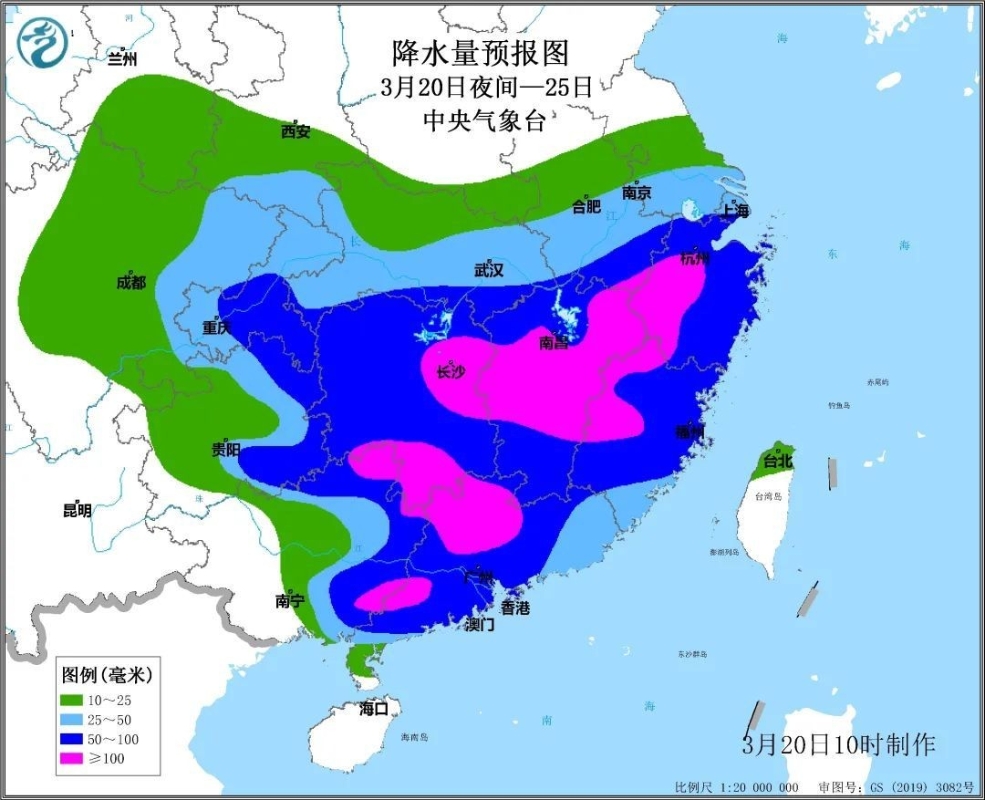 預計3月20日夜間至3月25日, 南方地區將出現大範圍較強降雨過程和今年首次大範圍強對流天氣過程。 其中,江南和華南部分地區有暴雨,局地大暴雨;湖南東部和南部、江西中部、浙江西部、福建西部、廣西北部和東南部、廣東北部和西南部等地累計降雨量有80~110毫米,局地可達160毫米 ,最大小時降雨量可達20~40毫米。 8~10級雷暴大風、冰雹、短時強降水等強對流天氣主要發生在江南中南部、華南中北部及貴州東部等地。