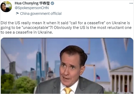 美官員稱呼籲俄烏停火“不可接受”,華春瑩發推反問分享到: