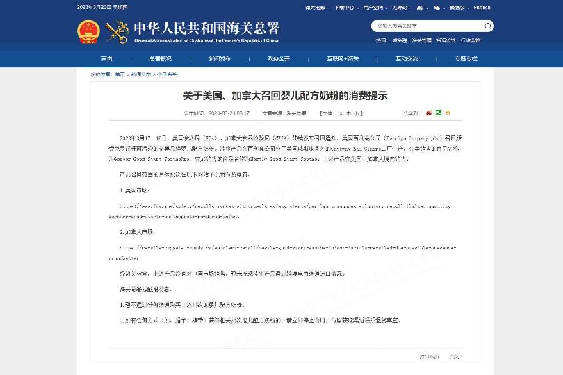 2023年3月17、18日,美國食藥局(FDA)、加拿大食品檢驗局(CFIA)陸續發佈召回通知,美國百利高公司(Perrigo Company plc)召回疑受克羅諾桿菌污染的雀巢品牌嬰兒配方奶粉。涉事產品在百利高公司位於美國威斯康星州的Gateway Eau Claire工廠生產,在美銷售的商品名稱為Gerber Good Start SoothePro,在加銷售的商品名稱為Nestlé Good Start Soothe。上述產品在美國、加拿大境內銷售。 產品召回範圍的具體批次在以下網站予以發佈及更新: 1.美國市場: https://www.fda.gov/safety/recalls-market-withdrawals-safety-alerts/perrigo-announces-voluntary-recall-limited-quantity-gerberr-good-startr-sootheprotm-powdered-infant 2.加拿大市場: https://recalls-rappels.canada.ca/en/alert-recall/nestle-good-start-soothe-infant-formula-recalled-due-possible-presence-cronobacter 經海關核查,上述產品沒有對中國市場銷售,暫未發現涉事產品通過跨境電商渠道進口情況。 海關總署提醒消費者: 1.暫不通過任何渠道購買上述批次的嬰兒配方奶粉。 2.如有任何方式(如:贈予、攜帶)獲得相關批次嬰兒配方奶粉的,請立即停止食用,與原獲取渠道聯繫退貨事宜。 【編輯:丘志彬】