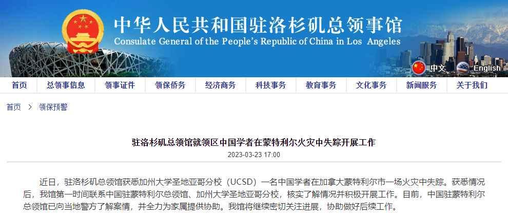 香港中通社3月24日電 據中國駐洛杉磯總領事館24日消息,近日,加州大學聖地亞哥分校(UCSD)一名中國學者在加拿大蒙特利爾市一場火災中失蹤。獲悉情況後,中國駐洛杉磯總領館第一時間聯繫中國駐蒙特利爾總領館、加州大學聖地亞哥分校,核實了解情況並積極開展工作。目前,中國駐蒙特利爾總領館已向當地警方了解案情,並全力為家屬提供協助。中國駐洛杉磯總領館將繼續密切關注進展,協助做好後續工作。