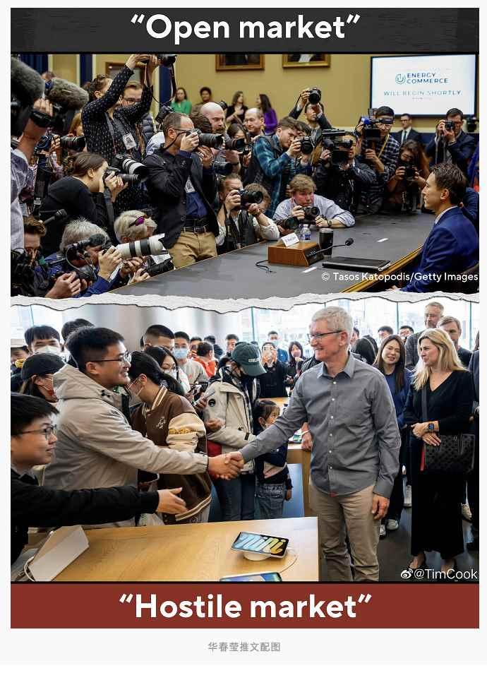 美國當地時間23日上午10時,TikTok首席執行官周受資出席美國國會眾議院能源和商務委員會聽證會,回應來自美方議員“國家安全”等方面的問題,引發全球輿論關注。值得注意的是,當天美國議員提出諸如TikTok“是否需要接入WiFi”等缺乏常識、只為將話題強行引向“美國用戶被監控”的離譜問題。不光讓現場的周受資一度無言,將聽證會開成“網絡知識普及大會”,也成為TikTok用戶群嘲的對象。就連美媒CNN也認為,華盛頓針對TikTok的態度已經歇斯底里了。 而在北京時間24日下午,有網友在微博發佈視頻稱,蘋果首席執行官庫克現身北京三里屯蘋果零售店。庫克本人當天晚上也發佈微博,表示很高興見到團隊和顧客。 此背景下,華春瑩在推特發文對上述事件進行對比,並配上了一張圖。圖上方是TikTok首席執行官周受資在美國會冷靜面對“長槍短炮”的場景,文字說明為所謂的“開放市場”;圖下方則是蘋果首席執行官庫克在北京三里屯蘋果零售店受到熱情接待的場景,文字說明為“敵意市場”。 諷刺意味不言而喻。 此外,據媒體報道,美國會眾議長麥卡錫本月26日曾聲稱,將推進涉及TikTok的立法。27日,中國外交部例行記者會上,發言人毛寧表示,我們已經多次就這個問題表明立場。美方在沒有任何證據證明TikTok威脅美國國家安全的情況下,一再對有關企業搞“有罪推定”、無理打壓。 “專業問題應該通過專業方式來解決,打壓別人不能讓自己更強大。”毛寧說,美方應當切實尊重市場經濟和公平競爭原則,停止無理打壓別國企業,為各國企業在美投資經營提供開放、公平、公正、非歧視的環境。 【編輯:丘志彬】