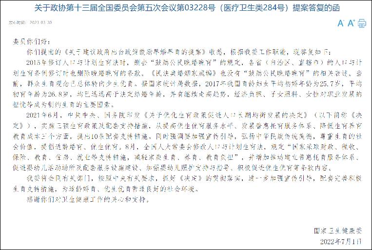 香港新聞網4月11日電 對於全國政協委員提出的《關於建議政府出台政策鼓勵早婚早育的提案》,國家衛生健康委官網日前公開相關答復。國家衛健委在答復中指出,2015年修訂人口與計劃生育法時,刪去“鼓勵公民晚婚晚育”的規定,各省(自治區、直轄市)的人口與計劃生育條例修訂時也刪除了晚婚晚育的條款。《民法典婚姻家庭編》也沒有“鼓勵公民晚婚晚育”的相關表述。當前,群眾生育觀念已總體轉向少生優育。 國家衛健委表示,將會同有關部門,按照中央有關要求,抓好《關於優化生育政策促進人口長期均衡發展的決定》的貫徹落實,進一步加強宣傳引導,配套完善積極生育支持措施,為適齡婚育、優生優育營造良好的社會環境。