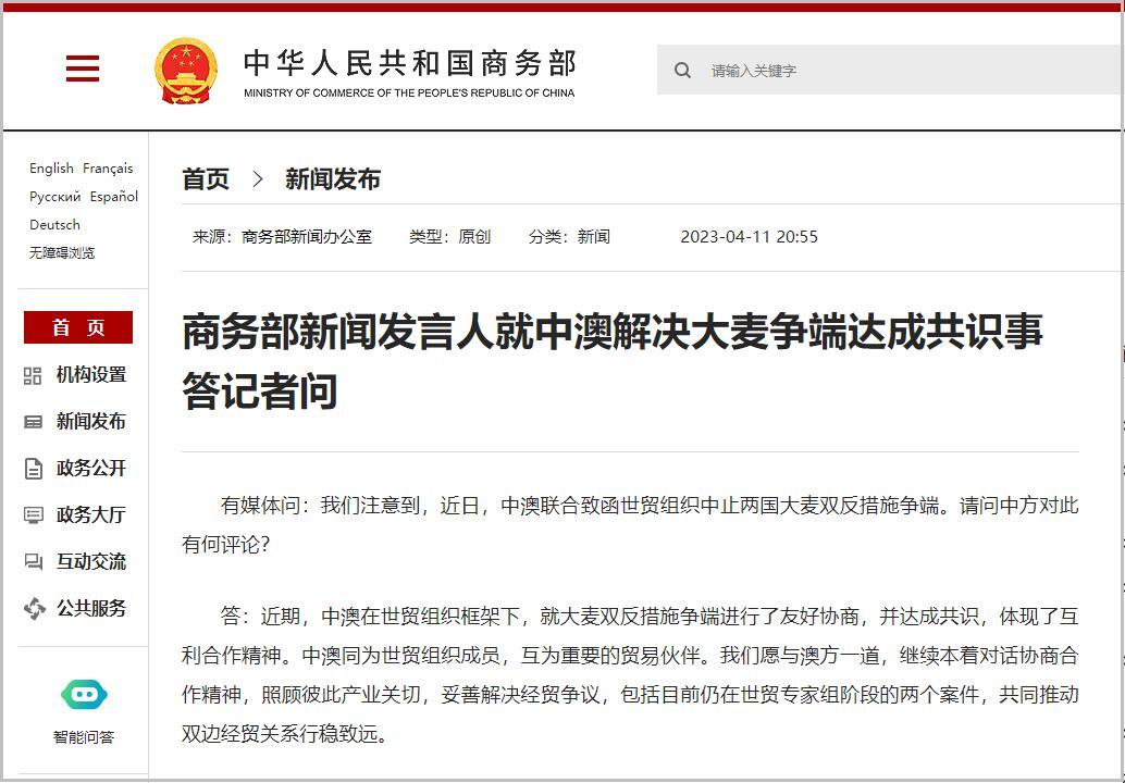 香港新聞網4月12日電 據中國商務部網站4月11日晚消息,商務部新聞發言人就中澳解決大麥爭端達成共識事答記者問。 有媒體問:我們注意到,近日,中澳聯合致函世貿組織中止兩國大麥雙反措施爭端。請問中方對此有何評論? 答:近期,中澳在世貿組織框架下,就大麥雙反措施爭端進行了友好協商,並達成共識,體現了互利合作精神。中澳同為世貿組織成員,互為重要的貿易夥伴。我們願與澳方一道,繼續本著對話協商合作精神,照顧彼此產業關切,妥善解決經貿爭議,包括目前仍在世貿專家組階段的兩個案件,共同推動雙邊經貿關係行穩致遠。