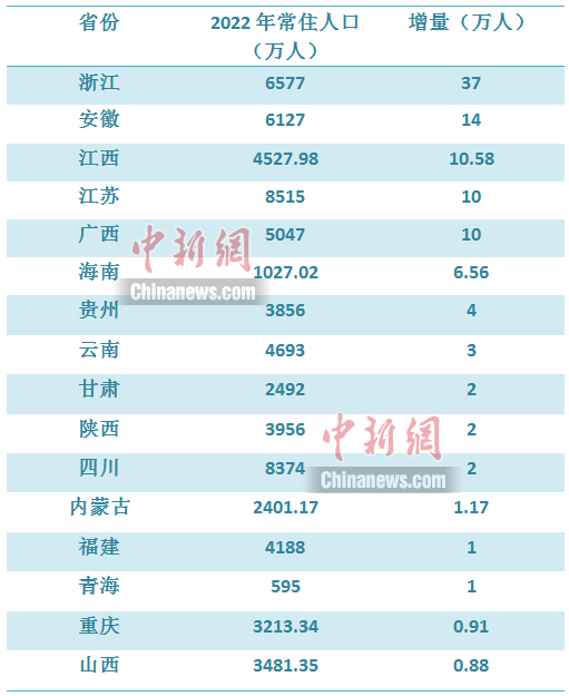 部分省份2022年人口正增長。製圖 李金磊 過半省份常住人口仍正增長 國家統計局的數據顯示,2022年末全國人口141175萬人,比上年末減少85萬人。 在此背景下,2022年,全國仍有超過一半的省份常住人口正增長。 從地理位置來看,其中很多省份處於中西部地區。比如,安徽、江西、廣西、貴州、甘肅、青海、重慶、雲南、四川等。 馮文猛認為,一方面,從生育水平來看,相對於東部地區,中西部地區的生育水平整體要高一些。另一方面,從人口流動來看,近些年中西部地區的人口吸引力在進一步增強,隨著產業逐步向中西部轉移以及本地就業機會增加,外出打工就業的人員回流,對人口的機械增長形成了正向貢獻。另外,中西部一些省份經濟增長較快,對人口的凝聚能力也進一步提升。 以江西為例,江西2022年GDP突破3萬億元,增長為4.7%,增速與福建並列全國第一。數據顯示,2022年江西常住人口增加10.58萬人。 江西統計局解釋,全省人口總量增加主要是因為人口凈流出規模減少,據測算,2022年全省凈流出約506萬人,比2021年減少約9萬人。一是跨省外出務工人員回流。2022年全省經濟快速發展,承接產業轉移力度加大,營商環境日益優化,穩就業、保就業政策紅利持續釋放,疊加疫情影響,更多人選擇返鄉創業或就近務工;二是人才吸引力度加大。全省深入推進人才強省戰略,進一步深化人才發展體制機制改革,多地相繼推出人才發展新政策,持續加大人才引進力度,同時也吸引了更多高校畢業生留贛就業。 【編輯:丘志彬】