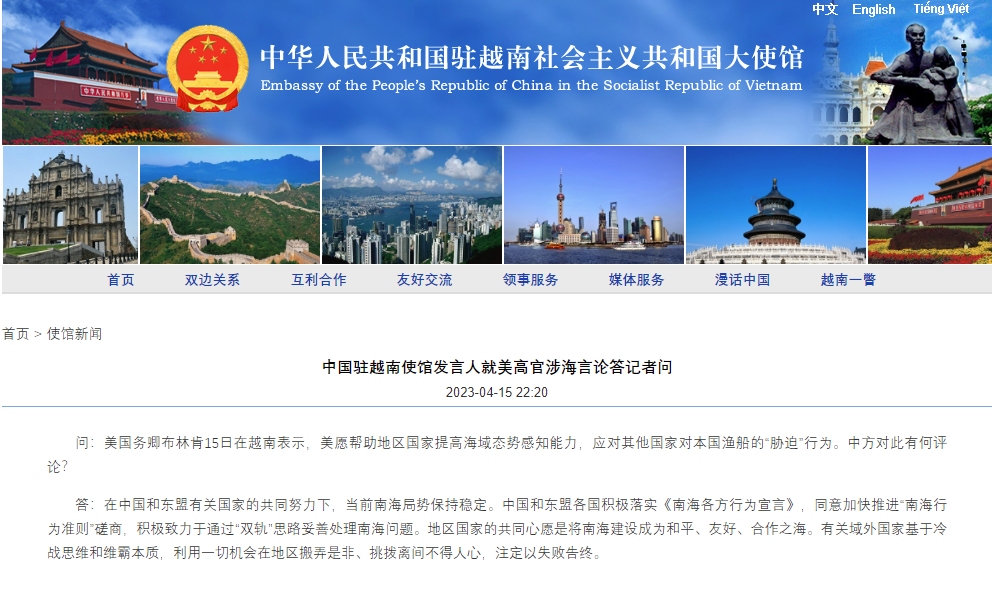 香港新聞網4月16日電 4月15日,據中國駐越南大使館網站,中國駐越南使館發言人就美高官涉海言論答記者問。