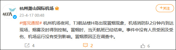 香港新聞網4月17日電 @杭州蕭山國際機場 4月17日發佈情況通報:杭州機場夜間,T3航站樓H島出現冒煙現象,機場消防隊2分鐘內到達現場,煙霧及時得到控制。冒煙時,當天航班已經結束。事件中沒有人員受困及受傷,機場運行沒有受到影響。冒煙原因正在調查中。