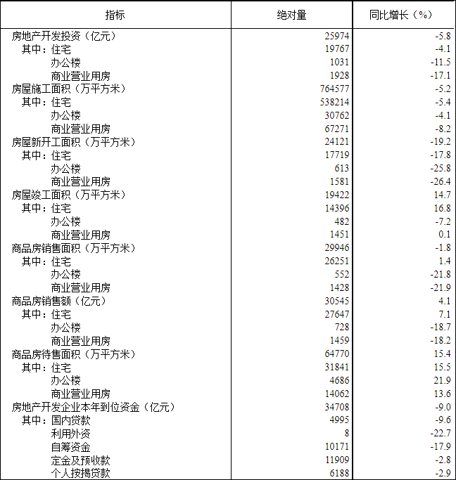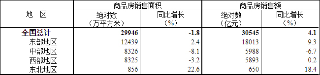 1—3月份,房地產開發企業房屋施工面積764577萬平方米,同比下降5.2%。其中,住宅施工面積538214萬平方米,下降5.4%。房屋新開工面積24121萬平方米,下降19.2%。其中,住宅新開工面積17719萬平方米,下降17.8%。房屋竣工面積19422萬平方米,增長14.7%。其中,住宅竣工面積14396萬平方米,增長16.8%。 二、商品房銷售和待售情況 1—3月份,商品房銷售面積29946萬平方米,同比下降1.8%,其中住宅銷售面積增長1.4%。商品房銷售額30545億元,增長4.1%,其中住宅銷售額增長7.1%。