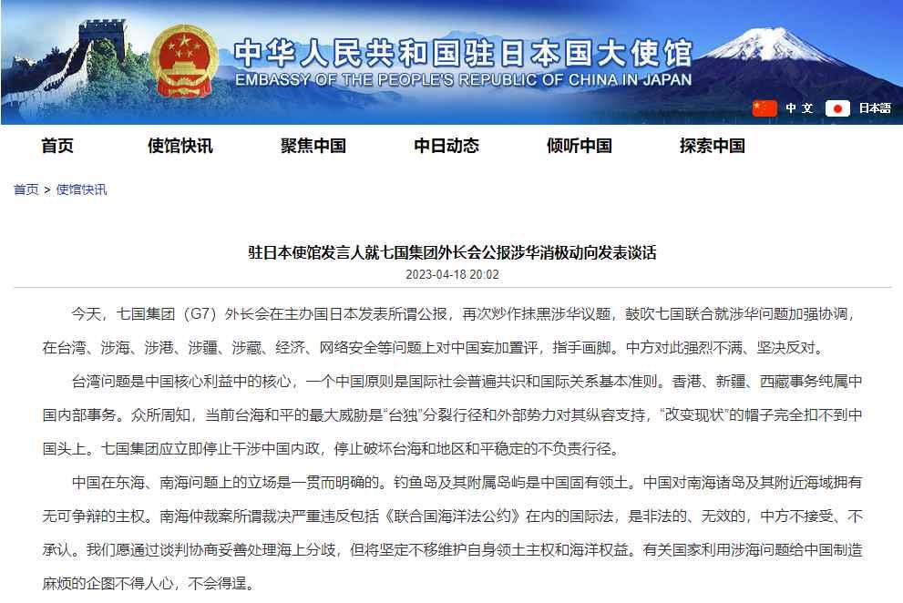香港新聞網4月19日電 據中國駐日本大使館網站4月18日消息,當天,七國集團(G7)外長會在主辦國日本發表所謂公報,再次炒作抹黑涉華議題,鼓吹七國聯合就涉華問題加強協調,在台灣、涉海、涉港、涉疆、涉藏、經濟、網絡安全等問題上對中國妄加置評,指手畫腳。中方對此強烈不滿、堅決反對。