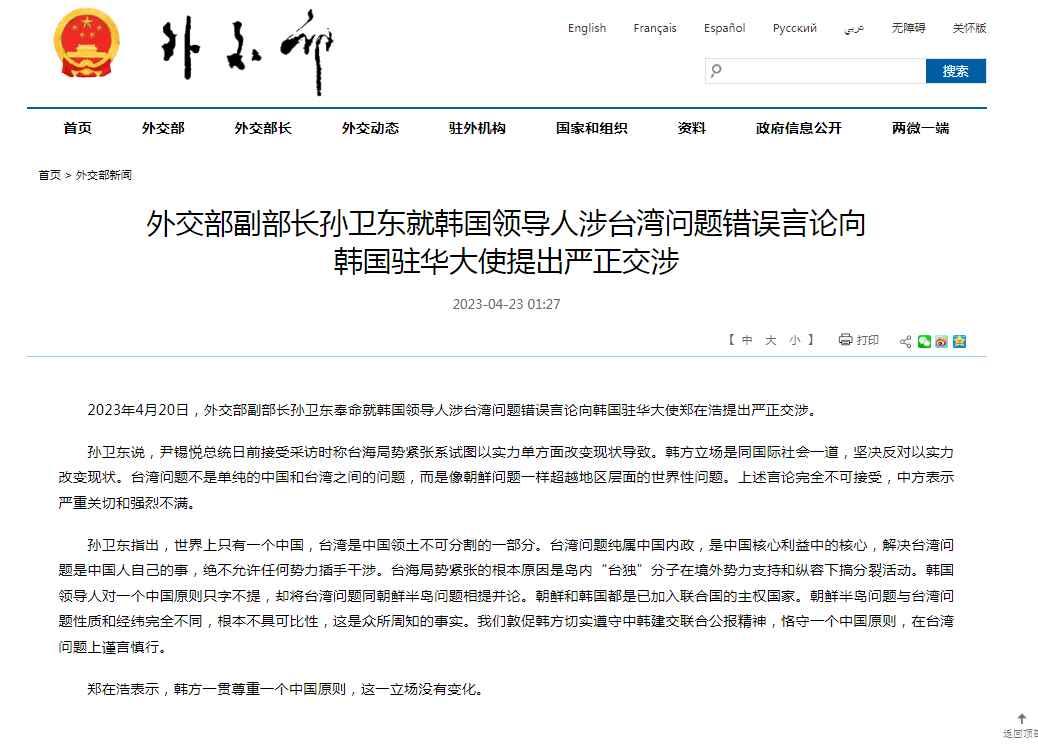 香港新聞網4月23日電 據中國外交部網站消息,2023年4月20日,外交部副部長孫衛東奉命就韓國領導人涉台灣問題錯誤言論向韓國駐華大使鄭在浩提出嚴正交涉。