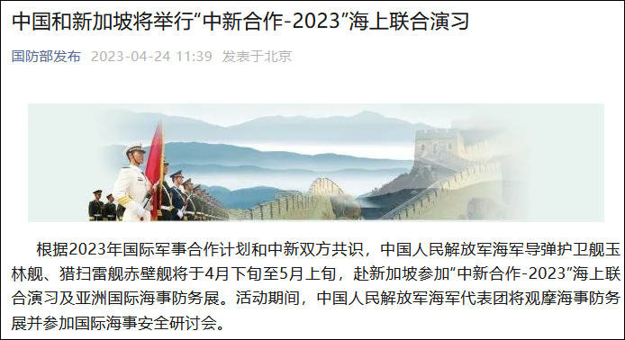香港新聞網4月24日電 據微信公眾號“國防部發佈”4月24日消息,根據2023年國際軍事合作計劃和中新雙方共識,中國人民解放軍海軍導彈護衛艦玉林艦、獵掃雷艦赤壁艦將於4月下旬至5月上旬,赴新加坡參加“中新合作-2023”海上聯合演習及亞洲國際海事防務展。活動期間,中國人民解放軍海軍代表團將觀摩海事防務展並參加國際海事安全研討會。