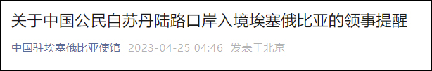 中國駐蘇丹、駐埃塞俄比亞大使館積極協助中國公民撤離蘇丹香港新聞網4月25日電 據微信公眾號“中國駐埃塞俄比亞使館”4月25日消息,近日,蘇丹安全形勢急劇惡化,陸續有中國公民自行撤離,從蘇丹-埃塞俄比亞邊境入境埃塞俄比亞。中國駐蘇丹、駐埃塞俄比亞大使館密切關注、積極協助中國公民撤離蘇丹、入境埃塞俄比亞,駐埃塞俄比亞使館已派出協助組前往埃塞俄比亞西北部的貢德爾市(Gondar)和米提瑪(Metema)口岸。為進一步做好相關安全保護工作,駐蘇丹、駐埃塞俄比亞大使館提醒計劃自行撤離赴埃塞俄比亞的中國公民: