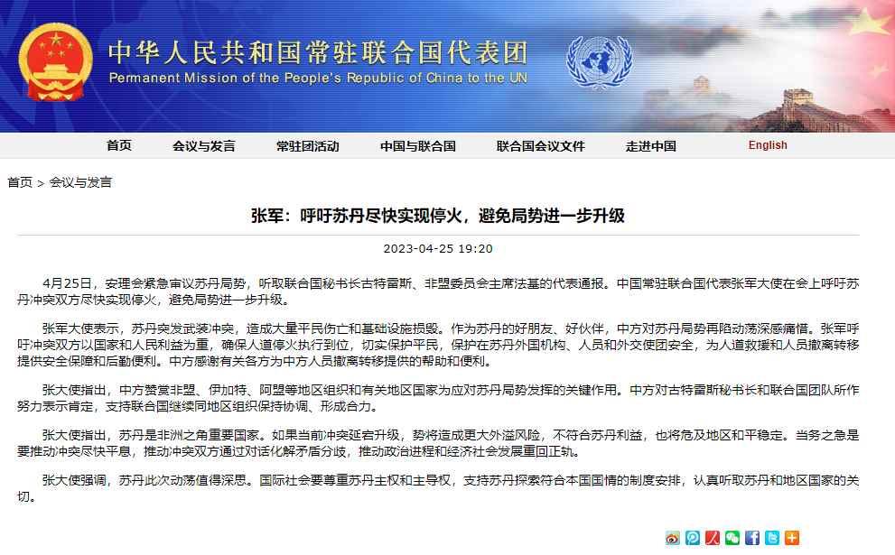 安理會緊急審議蘇丹局勢,中方呼籲蘇丹衝突雙方盡快實現停火分享到: