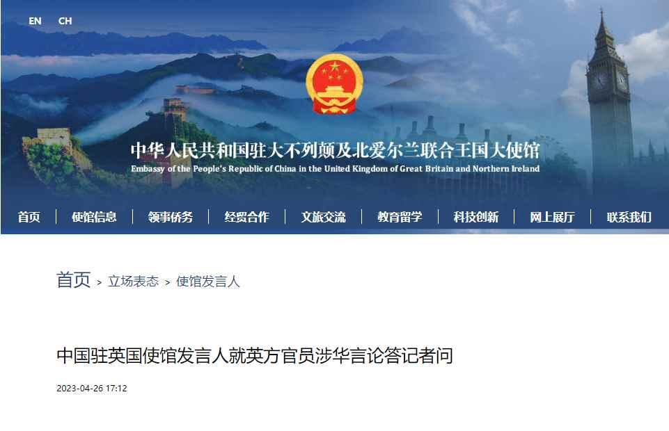 我使館敦促英方:懸崖勒馬,謹言慎行香港新聞網4月27日電 據中國駐英國大使館網站26日消息,中國駐英國使館發言人就英方官員涉華言論答記者問。
