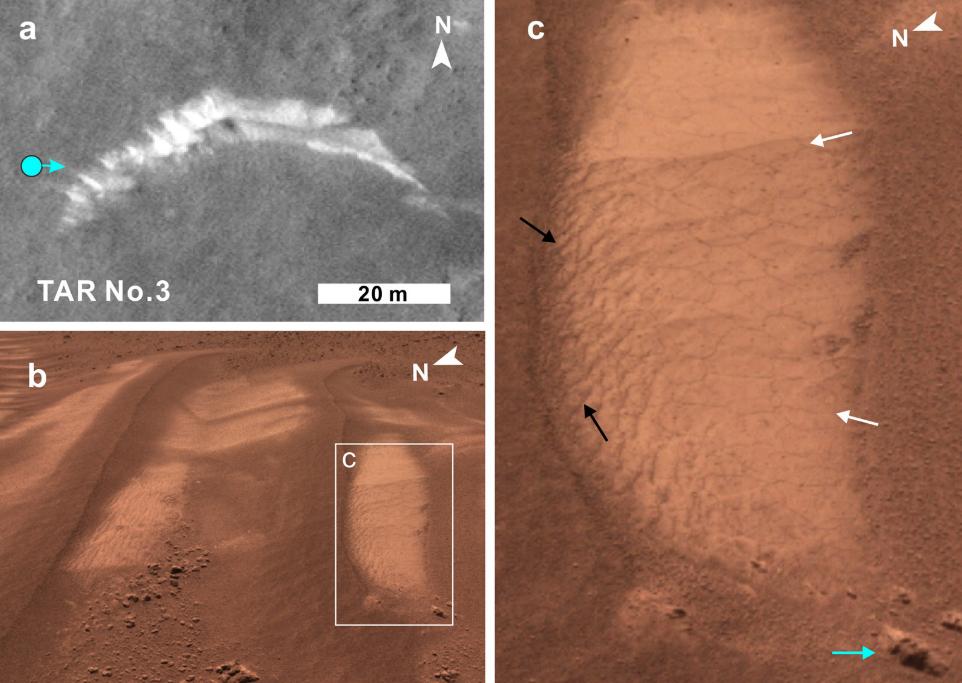 香港新聞網4月27日電 近日,中國地質大學(武漢)研究團隊首次在火星橫向風成脊表面識別出小型多邊形裂隙。研究發現裂隙分布區的表面可能存在石膏等含水硫酸鹽礦物,為了解火星表面水活動,評估當前火星的宜居性這一關鍵科學問題,提供了新線索。相關成果於近日發表在國際期刊《地球物理研究通訊》。