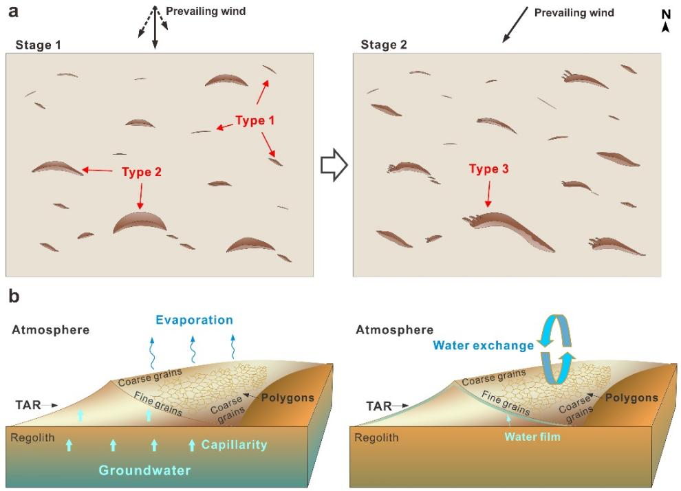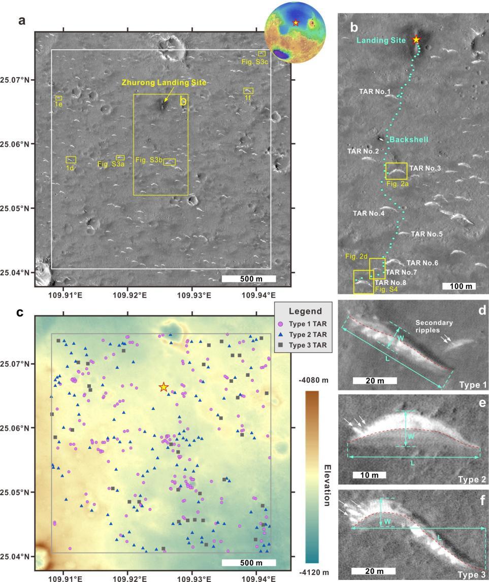 “祝融號”著陸區TARs的類型與分布 2021年5月,我國“天問一號”探測器攜帶的“祝融號”火星車著陸於烏托邦平原南部,在其著陸及巡視範圍內分布有大量的橫向風成脊(TAR)。橫向風成脊是火星表面一類特殊的風成地貌,是研究火星大氣運動及氣候特征的重要載體。本研究利用高分辨率遙感數據,在火星車著陸區2km×2km範圍內識別出354個橫向風成脊,並根據形態特性劃分出三個類型,提出了該區域橫向風成脊的兩階段演化模型,指示著陸區當地的盛行風向曾經發生過一次顯著的改變。