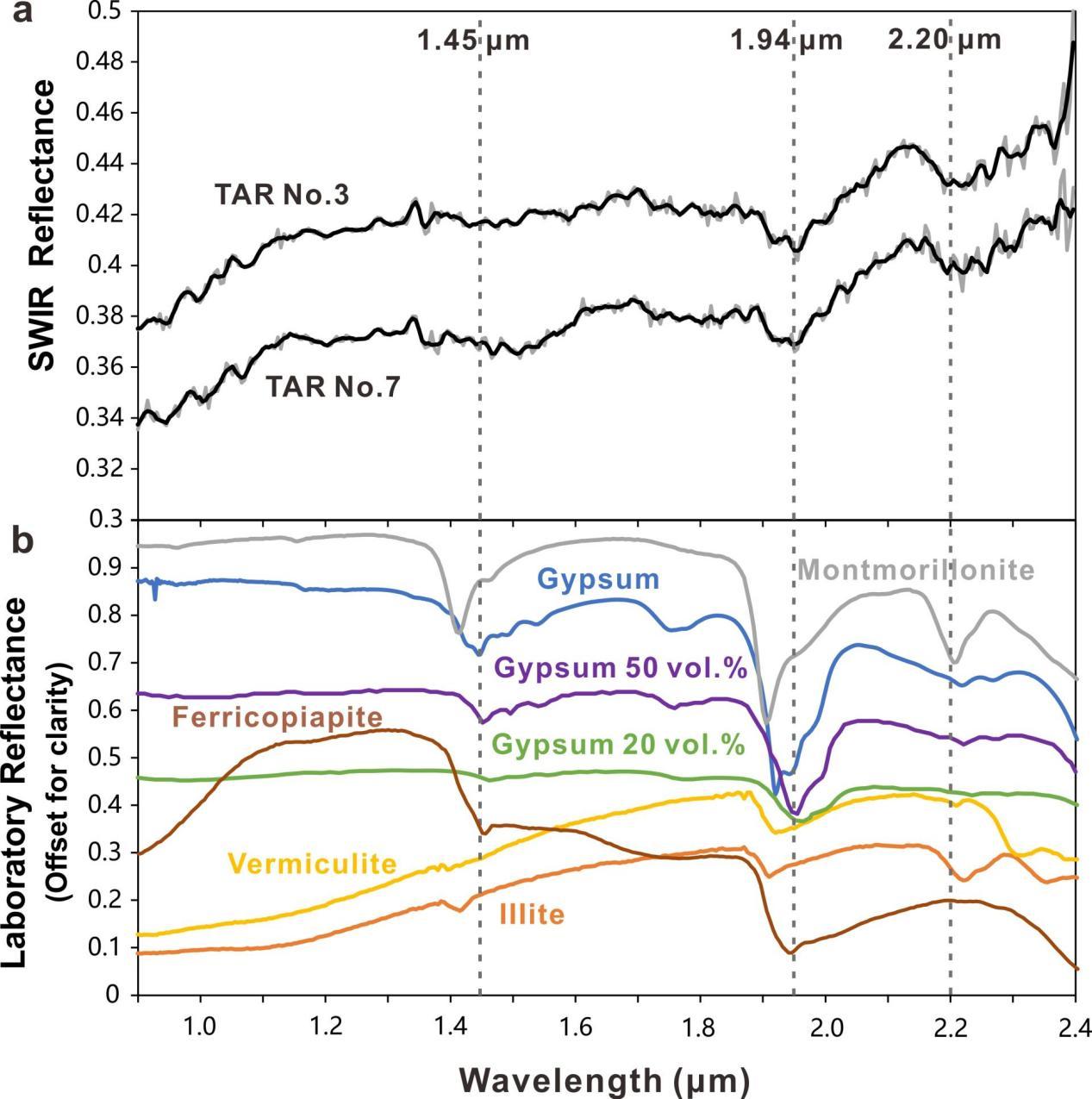 “祝融號”獲得的TAR表面多邊形裂隙區域的原位光譜與實驗室光譜的對比 基於上述分析結果,結合著陸區的地質背景,研究認為這些多邊形裂隙可能存在兩種成因:地下水通過毛細作用被輸送至橫向風成脊表面,在水分蒸發過程中表面收縮形成多邊形;地表與大氣中的水汽交換導致橫向風成脊表面形成硬化的砂質殼層,殼層破裂形成多邊形裂隙。在當前的火星環境條件下,第二種成因機制最為可能。 同時,由於橫向風成脊是火星表面較為年輕的地貌(可能小於100萬年),且這些多邊形裂隙在橫向風成脊演化的後期形成,因此它們可能指示了火星近期水活動及地表—大氣水的交換過程,從而為研究火星在當前寒冷乾旱氣候條件下的水循環提供了線索。 【編輯:丘志彬】