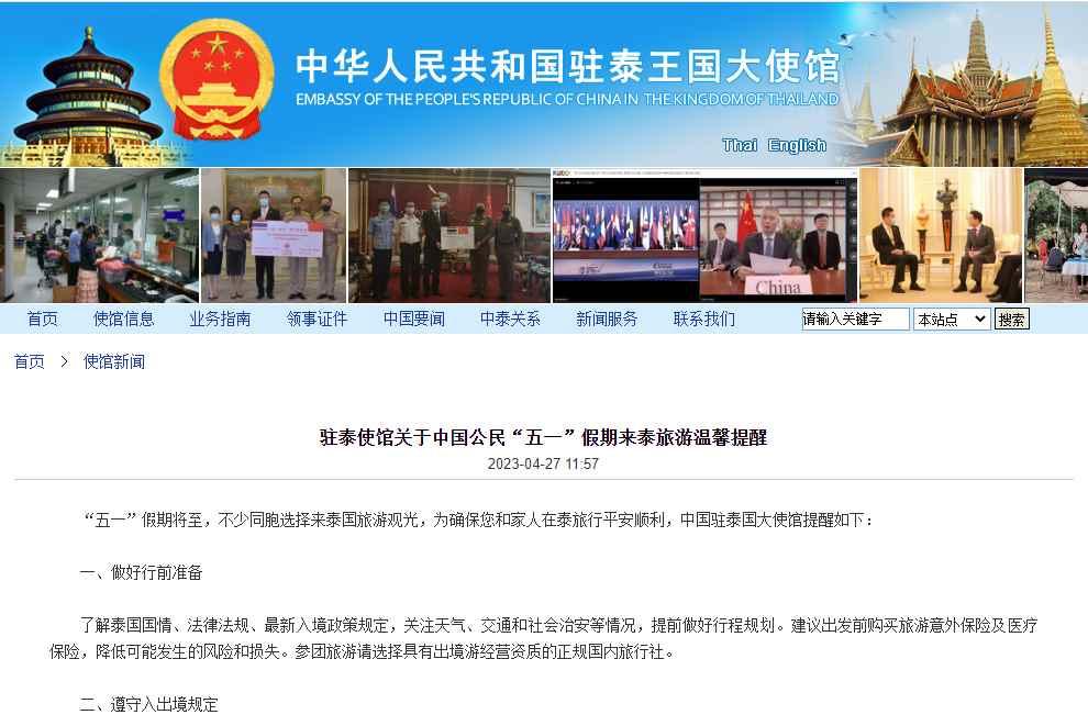 截圖。圖源:中國駐泰國大使館網站 全文如下: “五一”假期將至,不少同胞選擇來泰國旅遊觀光,為確保您和家人在泰旅行平安順利,中國駐泰國大使館提醒如下: 一、做好行前準備 了解泰國國情、法律法規、最新入境政策規定,關注天氣、交通和社會治安等情況,提前做好行程規劃。建議出發前購買旅遊意外保險及醫療保險,降低可能發生的風險和損失。參團旅遊請選擇具有出境遊經營資質的正規國內旅行社。 二、遵守入出境規定 遵守泰國入出境相關規定,了解可以攜帶物品的品種和數量等,尤其要留意關於食品、藥品、煙酒、現金、退稅等規定,不要擅自攜帶新鮮水果入境泰國,避免產生不必要的麻煩和損失。入出境時配合泰移民局、海關檢查。請注意在泰停留期限,避免超期滯留。 三、注意交通安全 泰當地路況較為復雜,車速普遍較快,交通事故高發。車輛右舵左行,與國內交通習慣相反,遊客過馬路時請多加留意來往車輛。外出乘坐大巴、面包車或出租車時務必系好安全帶。如無國際駕照或泰國駕照,請勿租駕摩托車、汽車。 四、慎選涉水項目 遊客在泰溺水意外時有發生,請謹慎參與浮潛、衝浪等風險系數較高的涉水項目。乘坐快艇和遊船時務必全程穿好救生衣。下水時最好結伴同行,相互照料,確保安全,空腹、飽餐、酒後、疲勞等身體狀態下切勿冒險下水。如遇風大浪急、海況危險,海灘插紅旗禁止遊客下海,請務必遵守。 五、加強安全防範 增強自我安全防範意識,保護人身財產安全。外出盡量結伴而行,妥善保管證件財物。不隨身攜帶大量現金,在車站、景點、商場、餐廳等人員聚集地看管好個人物品。謹慎同陌生人搭話,不要露財炫富,避免深夜外出。 六、做好健康防護 近期泰國新冠疫情有所反彈,同時也要注意防範登革熱等疾病,出現發燒或肌肉疼痛等癥狀,請及時前往醫院就醫。泰國天氣炎熱,室內外溫差較大,出行宜勞逸結合,量力而行。就餐請選擇正規餐廳,注意食品衛生,切勿貪涼暴飲。 七、文明守法出遊 遵守泰國法律法規,尊重當地風俗習慣,展現中國遊客良好素質和文明形象。在泰期間吸食大麻,回國後被查驗出,將受到相應法律處罰。攜帶、行李夾帶大麻或大麻制品入境中國屬於刑事犯罪。請珍愛生命,自覺自律。為避免無意中購買到含有大麻成分的物品,可通過包裝上大麻葉子的標志以及是否有THC、CBD字樣來辨認。 中國公民在泰旅行期間如人身安全和合法權益受到侵害,請及時報警並聯繫中國駐泰使領館尋求協助。 相關機構聯絡電話 泰國報警電話 191 泰國急救電話 1669 旅遊警察熱線 1155 泰國疾病控制廳 1422 泰國移民局電話 1178 外交部全球領事保護與服務應急呼叫中心+86-10-12308,+86-10-65612308 駐泰國大使館領保電話02-245-7010 駐清邁總領館領保電話 081-882-3283 駐宋卡總領館領保電話 081-766-5560 駐孔敬總領館領保電話 080-936-6070 駐普吉領辦領保電話094-595-6158 【編輯:馬華】