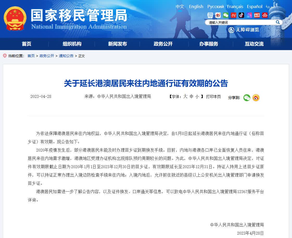 香港新聞網4月28日電 為依法保障港澳居民來往內地權益,中華人民共和國出入境管理局決定,自5月8日起延長港澳居民來往內地通行證(俗稱回鄉證)有效期。現公告如下: 2020年疫情發生後,部分港澳居民未能及時辦理回鄉證到期換發手續。目前,內地與港澳各口岸已全面恢復人員往來,港澳居民來往內地需求激增,港澳地區受理辦證機構出現排隊預約周期較長的問題。為此,中華人民共和國出入境管理局決定,對證件有效期限截止日期為2020年1月1日至2023年12月30日的回鄉證,有效期限延長至2023年12月31日。持證人持用上述回鄉證原件,可以持證正常辦理出入境邊防檢查手續來往內地;入境內地後,允許前往就近的縣級以上公安機關出入境管理部門申請換發回鄉證。 港澳居民如需進一步了解公告內容,以及證件換發、口岸通關等信息,可以致電中華人民共和國出入境管理局12367服務平台詳詢。