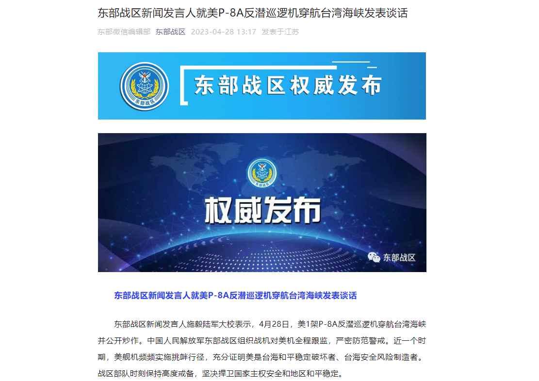 香港新聞網4月28日電 據微信公眾號“東部戰區”消息,東部戰區新聞發言人施毅陸軍大校表示,4月28日,美1架P-8A反潛巡邏機穿航台灣海峽並公開炒作。中國人民解放軍東部戰區組織戰機對美機全程跟監,嚴密防範警戒。近一個時期,美艦機頻頻實施挑釁行徑,充分證明美是台海和平穩定破壞者、台海安全風險製造者。戰區部隊時刻保持高度戒備,堅決捍衛國家主權安全和地區和平穩定。