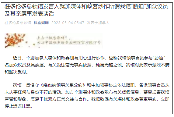 加拿大媒體和政客炒作中領館“脅迫”加眾議員,我領館駁斥分享到: