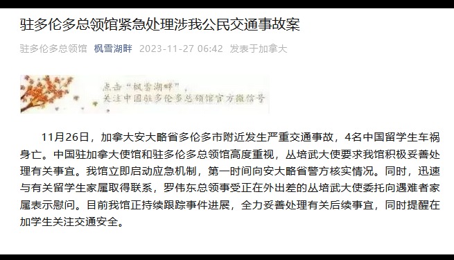 香港新聞網5月4日電 據駐多倫多總領館微信公眾號“楓雪湖畔”5月4日消息,近日,個別加拿大媒體和政客別有用心進行炒作,誣稱我館領事官員參與“脅迫”一名加眾議員及其親屬。有關說法毫無事實依據,純屬無稽之談。我館對此表示強烈不滿和堅決反對。 我館一貫恪守《維也納領事關係公約》和中加領事協定依法履職,各級領事官員從未從事任何與身份不符的活動。加方個別媒體和政客散布有關虛假信息,蓄意損害我館聲譽和形象,惡意干擾雙方正常交往與合作。我館敦促有關媒體和政客尊重事實,立即停止造謠抹黑。